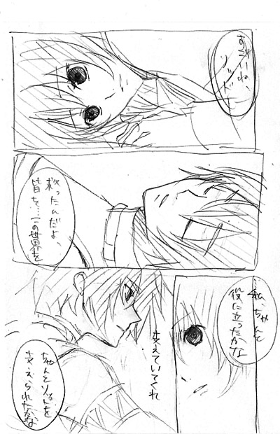 きみがいたからがんばれたんだエターニアのエンディングムービー、短いけどすごく好きです。 あの後、きっとファラの方が先に目を覚ますんだろうなぁ、と 妄想しながら。げへへ…。 リファラはお互いがお互いを必要としていそうな感じがたまらなくすき* 本人たちが気づいてなくても絶対そうだと思う。 支えて支えられてるっていうなんかこう…!!!!(言葉にならん!) ちなみにリファラはらぶらぶ〜とかでなく自然にいつも一緒、みたいな感じがいいです。 絶対幸せになってほしい……!!!(>w<) 結構気合入れて描いたのに縮小したら潰れちゃったりして(ノ_;)メソリ というわけで巨大&重いVer. ▼おまけ超雑漫画(中途半端)▼ ![]()